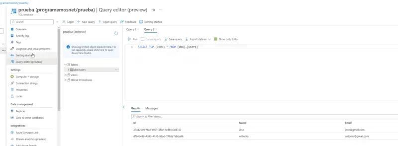 En este caso, vamos a utilizar una base de datos que contiene una tabla de «users» ya creada previamente. A través de Azure Active Directory, vamos a consultar los registros que contiene.